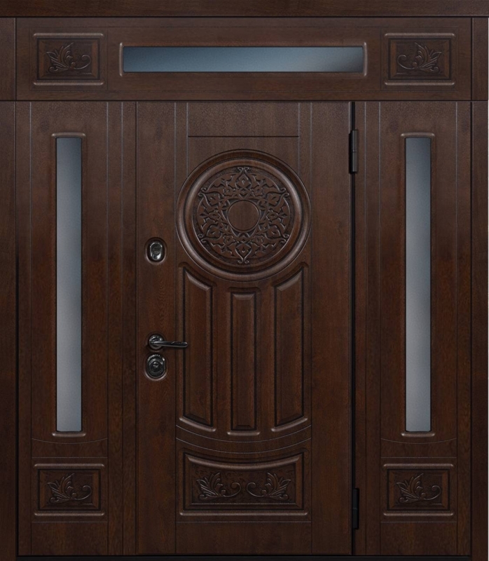 Эта нестандартная парадная дверь с фрамугой №6 — отличный выбор для тех, кто ценит элегантность и долговечность. Внешняя и внутренняя отделка из МДФ придает дверям стильный и современный вид, а также защиту от механических повреждений. МДФ устойчива к царапинам и вмятинам, что делает дверь идеальной для долгосрочной эксплуатации. Каркас из профильной трубы 50х25 мм и лист металла толщиной 2 мм обеспечивают прочность и надежность, а ребра жесткости из профильных труб гарантируют дополнительную устойчивость. В двери установлены блокираторы, два контура уплотнителей из резины, что повышает звуко- и теплоизоляцию. Замки от известных производителей, таких как Просам и Мосрентген, обеспечат надежную защиту. Возможность комбинировать отделку, добавлять зеркало, стеклопакет или кованые элементы позволяет легко адаптировать дверь под любые предпочтения. Нестандартная парадная дверь с фрамугой №6 от производителя: быстрое изготовление и монтаж в Коломне, индивидуальные размеры, широкий выбор материалов и фурнитуры, официальная гарантия до 10 лет.