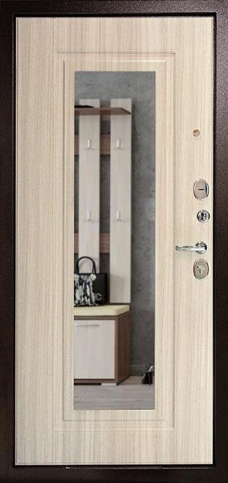 Прочный стальной каркас, лист металла толщиной 2 мм и система блокираторов делают эту модель надежным барьером для квартиры, офиса или частного дома. Внешняя поверхность покрыта молотковым напылением, устойчивым к механическим повреждениям и перепадам температуры, благодаря чему дверь сохраняет аккуратный вид долгие годы. Внутренняя накладка МДФ добавляет уюта и гармонично сочетается с интерьером прихожей. Зеркало на полотне выполняет не только декоративную функцию, но и делает пространство визуально шире. Зеленая входная дверь в квартиру №2 комплектуется двумя замками российских производителей — сувальдным Просам и цилиндровым Мосрентген, каждый из которых оснащён тремя ригелями. Два контура резинового уплотнения помогают минимизировать сквозняки и шум, а возможность выбрать сторону и тип открывания делает установку максимально удобной. При необходимости отделку, замки и дополнительные элементы можно адаптировать под индивидуальные требования. Зеленая входная дверь в квартиру №2 от производителя: быстрое изготовление и монтаж в Коломне, индивидуальные размеры, широкий выбор материалов и фурнитуры, официальная гарантия до 10 лет.