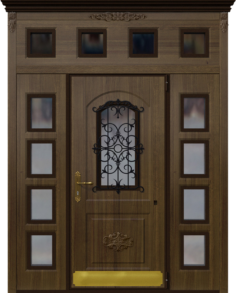 Эта модель выделяется своим масштабом и декоративностью: двухстворчатая дверь со вставками и ковкой №2 подчеркивает парадность входа и придает фасаду респектабельность. Основу составляет прочный каркас из стальных профильных труб с листом металла толщиной 2 мм и ребрами жесткости, что обеспечивает долговечность и защиту. Снаружи и внутри полотно облицовано накладками МДФ, которые позволяют воплотить различные варианты текстур и оттенков, сохраняя устойчивость к механическим повреждениям и влиянию внешней среды. Кованые элементы вносят в образ двери нотку изысканности и индивидуальности, делая ее центральным акцентом всего фасада. Для безопасности предусмотрены два замка турецкого производителя Kale Kilit — цилиндровый и сувальдный, каждый с ригелями, усиливающими защиту. Такая дверь сочетает надежность металлической конструкции с эстетикой классического дизайна, превращая вход в настоящий архитектурный акцент. Двухстворчатая дверь со вставками и ковкой №2 от производителя: быстрое изготовление и монтаж в Коломне, индивидуальные размеры, широкий выбор материалов и фурнитуры, официальная гарантия до 10 лет.